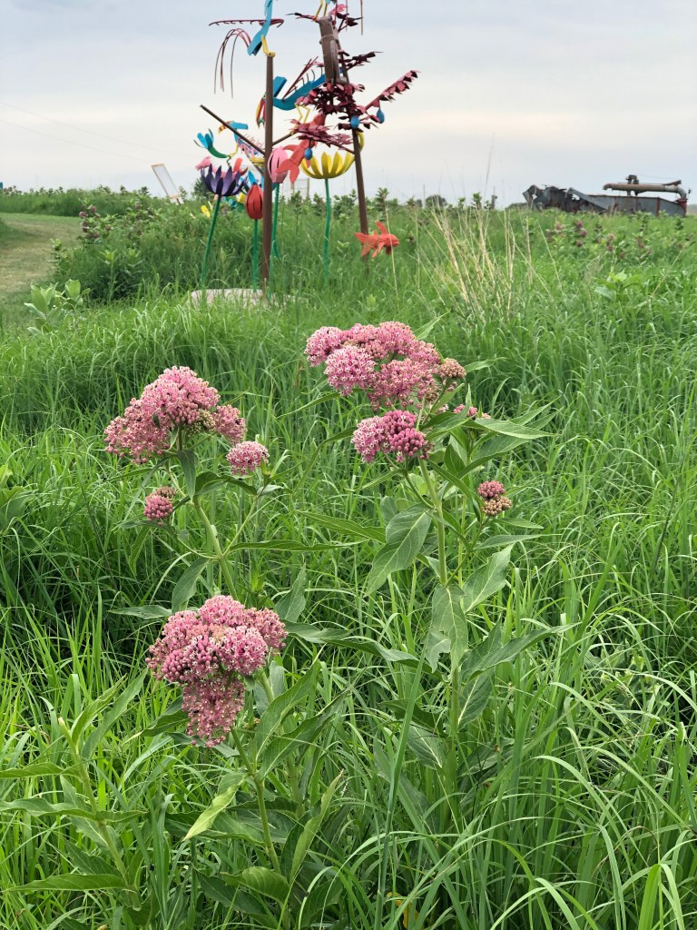 The park is something of a field that has been mostly reclaimed from the cows and is well kept. Watch your step though, there are some older cow pies around and little flags marking the holes that have been dug by some sort of ground squirrel or another. It looks like a small prairie dog – they were pretty cute but kept startling me when they charged between stands of tall grass. Also among the sculpture is old farming equipment and lovely flowers.